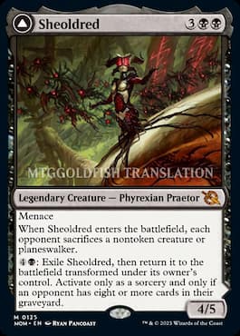 - Passive: When Sheoldred enters the battlefield, each opponent sacrifices a non-token creature or planeswalker