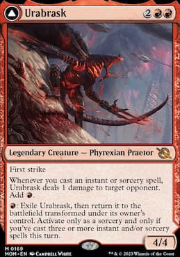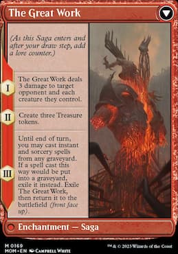 Synergizing with Izzet spell builds, is Urabrask//The Great Work, a unique Praetor Saga that can flip for only one Red mana. But it also requires three or more Instant or Sorcery spells to have been cast that turn, making Urabrask//The Great Work a narrow card to play.