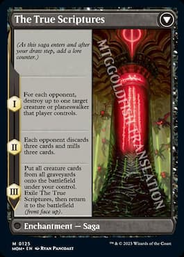 Each MOM Praetor has a passive ability attached to the front side of the card. And each has a paid activation cost required for the Praetor to Transform into a Saga. The Saga’s chapters are meant to end matches. But they are vulnerable to removal as well. Should a Saga complete itself, it Transforms back into the Praetor front side of the card.