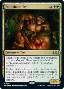 Roles in WOE are generated from permanents and players can’t attach more than one Role Enchant Aura token to a creature. Creatures like Faunsbane Troll create a Monster Role upon entering the battlefield while Living Lectern creates a Sorcerer Role upon the Artifact Construct getting sacrificed.