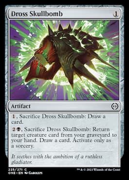Of all the Skullbombs in the ONE cycle, Dross Skullbomb might be the best. At a cost of 2B, players essentially get a two-for-one deal. Dross Skullbomb returns a target creature from your graveyard to hand, and it draws a card. Within sacrifice-themed builds and any decks using the MTG color Black, players may want to prioritize the Dross Skullbomb as a possible third or fourth pick.