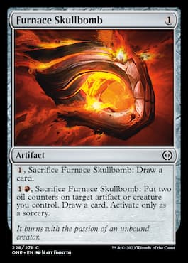 Having an activation cost of only 1R, Furnace Skullbomb synergizes with Oil counters. The color Red has the most Oil counter synergy in the ONE Limited format. Furnace Skullbomb can have a major impact on board states by adding two Oil counters through its second activated ability. With cards like Urabrask’s Forge and Migloz, Maze Crusher in the ONE set, Furnace Skullbomb can provide the necessary Oil counters right when they are needed most.