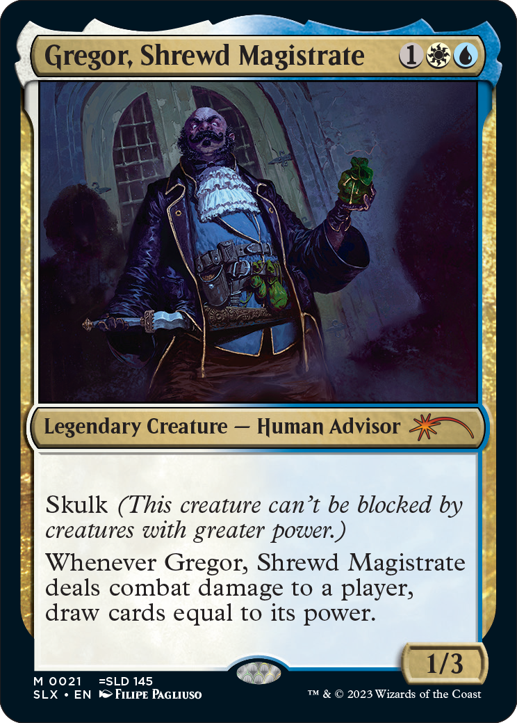 | Gisa’s Favorite Shovel (SLX) | Greensleeves, Maro-Sorcerer (DMU) | Gregor, Shrewd Magistrate (SLX) |