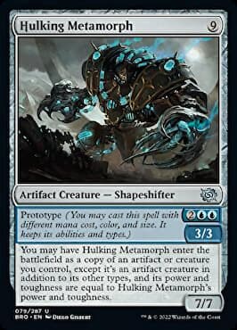 Capable of copying an Artifact or creature upon entering the battlefield, Hulking Metamorph will more often get cast at its Prototype cost of 2UU. Targets for the copy should include text that swings a board state advantage since the stats aren’t the focus.