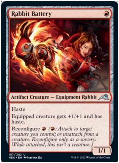 Rabbit Battery is an aggressive one-drop in the MTG color Red that has Haste and can get equipped to another creature via the NEO Reconfigure mechanic. The Artifact creature is often found within Rakdos Aggro Alchemy decks, providing early game value that can translate into late game value via Reconfigure for a cost of only one Red mana. Rabbit Battery has Haste and gives the creature it is equipped to Haste as well, along with +1/+1 stats.