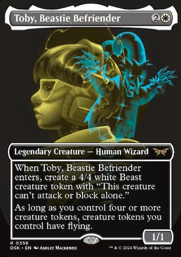 Entering the battlefield with a 4/4 creature token is Toby, Beastie Befriender. The MTG Human Wizard is great in go-wide strategies, granting creature tokens Flying if you control four or more. Toby, Beastie Befriender has decent value for a three-drop in White, giving your board state a solid early-game advantage.