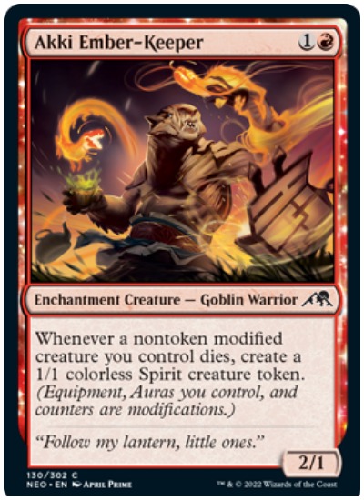 The Modification mechanic operates similar to cards that have tribal synergies in MTG in that a creature like Akki Ember-Keeper has an ability that creates a 1/1 token whenever a nontoken modified creature dies. This synergy supports having multiple creatures that are modified as opposed to dumping Modifications on just one main creature.