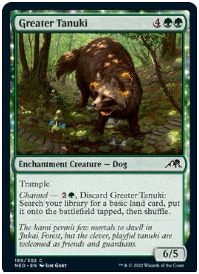 Greater Tanuki is an Enchantment creature that has a Channel cost of 2G. Players discard the dog in exchange for searching their library for a basic land that goes directly onto the battlefield tapped.