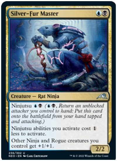 Activating the Ninjutsu mechanic costs mana. Creatures with the Ninjutsu mechanic have often contained abilities that reward a player upon dealing combat damage to a player. Silver-Fur Master is a rat ninja NEO creature that has its Ninjutsu activated for UB and two abilities. The first reduces the cost of Ninjutsu activated abilities by one and the second pumps all ninja and rogue creatures by 1/1.