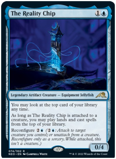 Another example of Reconfigure is found on the NEO card The Reality Chip. As an Artifact creature, it’s an 0/4 that lets a player look at the top card of their library at any time. Upon equipping it to another creature, its controller can play lands and cast spells from the top of their library. The Reality Chip has a Reconfigure cost of 2U.