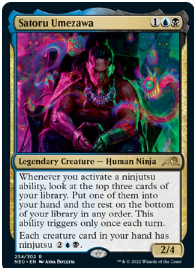 There are also NEO cards that synergize with the Ninjutsu mechanic, like the legendary creature Satoru Umezawa. Upon activating a Ninjutsu ability, Satoru Umezawa has an ability that lets its controller look at the top three cards of their library, putting one into their hand the rest at the bottom of their library in any order. It also has an ability that gives each creature in your hand Ninjutsu with a cost of 2UB.