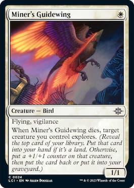 The Explore keyword action typically involves a trigger, whether it’s from a creature or through an Artifact like Map tokens. Many of the creatures from the original Ixalan set triggered the mechanic upon entering the battlefield. WotC changed things up in LCI through creatures like Miner’s Guidewing, in which another creature you control Explores when the bird dies.