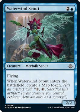Map tokens were first introduced through Lost Caverns of Ixalan as another way to Explore within MTG. Most Explore triggers took place upon a creature entering the battlefield through the Ixalan set. WotC continued that trend with a twist in LCI through a creature like Waterwind Scout, which creates a Map token upon entering the battlefield.