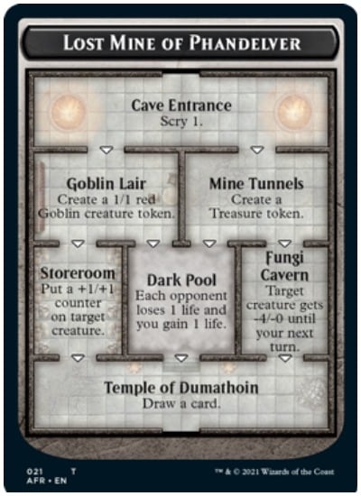 There are a total of three dungeons in AFR: Dungeon of the Mad Mage, Tomb of Annihilation, and Lost Mine of Phandelver. Each card features a different number of rooms and abilities within those rooms.