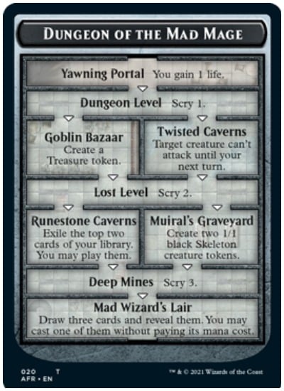 Dungeon of the Mad Mage contains the most rooms, nine rooms in total, and takes venturing through seven rooms to complete. Most likely ideal for stall and Control builds, the dungeon rooms offer abilities like Scry, gain one life, and playing exiled cards from that controller’s library.
