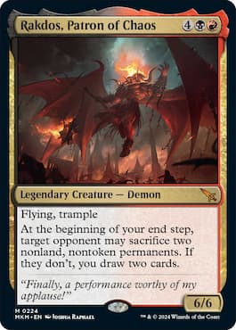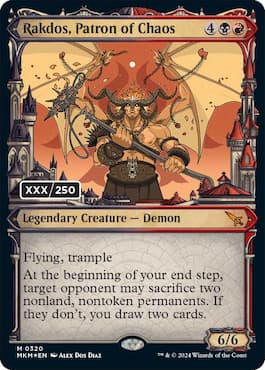 The Demon Rakdos has emerged from his lava pit in Murders at Karlov Manor to witness a performance worthy of his attention. Fitted with 6/6 stats and keywords like Flying and Trample, the Mythic Rare Demon forces opponents to sacrifice permanents at the beginning of your end step. And if they don’t, you get to draw two cards.