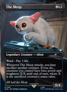 Synergizing with sacrifice builds is The Meep, a Legendary Alien with Ward and 0/4 stats. The Meep slots right into aggressive Red and Black decks, using cheap creatures on the battlefield as sacrificial fodder to boost the power and toughness of the rest of the team while The Meep attacks.