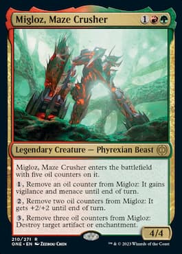 Migloz, Maze Crusher is packed with value and may have a significant impact within Standard Gruul decks. The Phyrexian beast is also a bomb in the ONE LImited format, where acquiring more Oil counters is easy to do in the color Red through creatures like Magmatic Sprinter.
