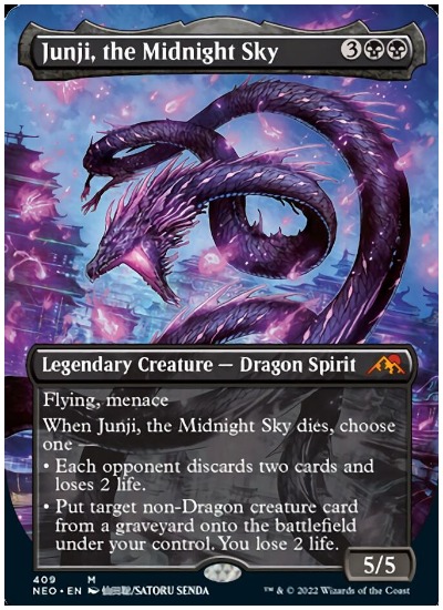 Junji, the Midnight Sky is popular within the Commander format and some Standard Mono-Black and Control decks. The dragon saw a spike in value after the release of DMU and another slight price increase after the release of Phyrexia: All Will Be One.