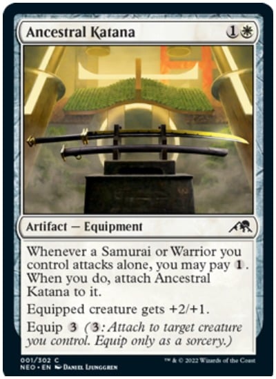 - First ability: Whenever a Samurai or Warrior you control attacks alone, you may pay one mana. When you do, attach Ancestral Katana to it.