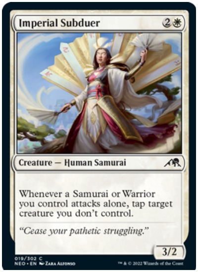 Imperial Subduer is a decent Common that shows what Samurai are looking to do. This creature taps an opponent’s creature when a Samurai or Warrior of yours attacks alone. Attacking alone is difficult because an opponent can generally just chump block or double block and kill your attacker.