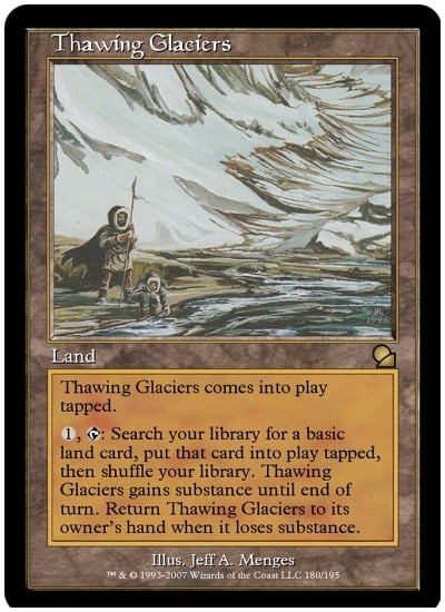 Thawing Glaciers is a great late-game card. It allows you to replay it and Fetch the required lands every two turns. Unlike other cards that are sacrificed, Thawing Glaciers remains in your hand and can be used to snowball the board.