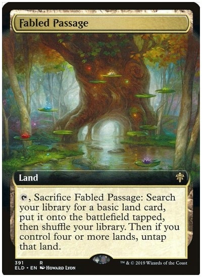 Fabled Passage is a simple Fetch land card with a huge upside towards the mid stage of the game. While it can be easily played early on to find a desired land, it will be played on board tapped. But if you have four or more lands, the land will be untapped, allowing you to use it instantly.
