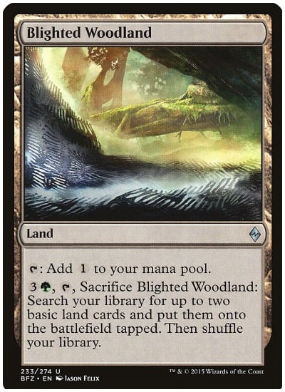 Blighted Woodland is a flexible Fetch card, giving you the possibility to add one non-colored mana to your pool or pay four mana to sacrifice it and Fetch two land cards tapped. While it’s one of the most expensive Fetch cards, it allows you to search for the same type of land or two different ones to ensure you have the resources to play other cards.