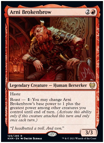 - First ability: Boast for one, you may change Arni Brokenbrow’s base power to one plus the greatest power among other creatures you control until the end of turn.