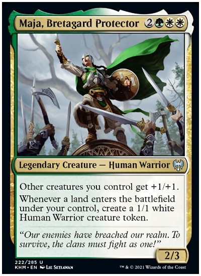 Maja, Bretagard Protector is a solid four-mana cost Human boosting your creatures with +1/+1. While it might seem costly for its 2/3 stats, it makes up for it in the ability to create tokens easily every time you play a land. The token will be summoned as a 1/1, but will be buffed up to 2/2 due to Maja’s first ability. Some EDH decks will be interested in running this card as their Commander. In Limited, however, this card will be strong due to it being an uncommon two-color token-maker.