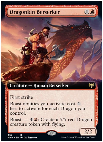 The 2/2 two-mana cost Dragonkin Berserker has great effects and stats for its cheap cost. It can fit easily into any Boast/tribal deck and can act as a great late-game finisher due to its ability to create 5/5 tokens with Flying. This card will be a strong pick in Limited and will be a great addition to most constructed decks as well.