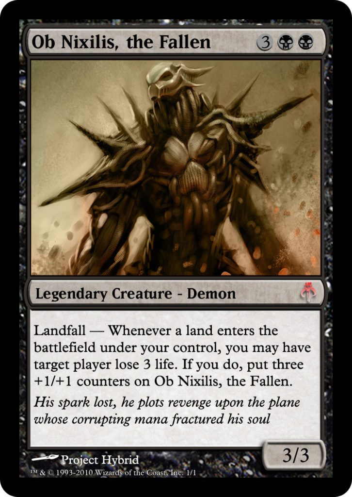 Ob Nixilis, the Fallen is an expensive Demon with a five-mana cost requiring two Black mana. Its stats are pretty mediocre, but the Landfall effect allows you to drain three life from your opponent and buff this card up to 6/6 in an instant.