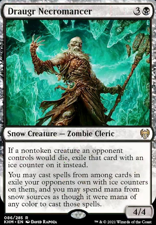 Draugr Necromancer is an upcoming four-mana cost Zombie Cleric allowing you to send creatures to exile instead of empowering your opponent’s graveyard. It can fit alongside Snow lands into a Zombie tribal deck due to its ability to nullify opposing decks tactics that rely on a wide graveyard pool. It can be a great tech card for Historic against creatures such as Uro, Titan of Nature’s Wrath, or Cat decks.