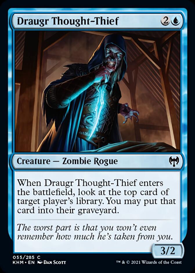 - First ability: When Draugr Thought-Thief enters the battlefield, look at the top card of target play’s library. You may put that card into their graveyard.