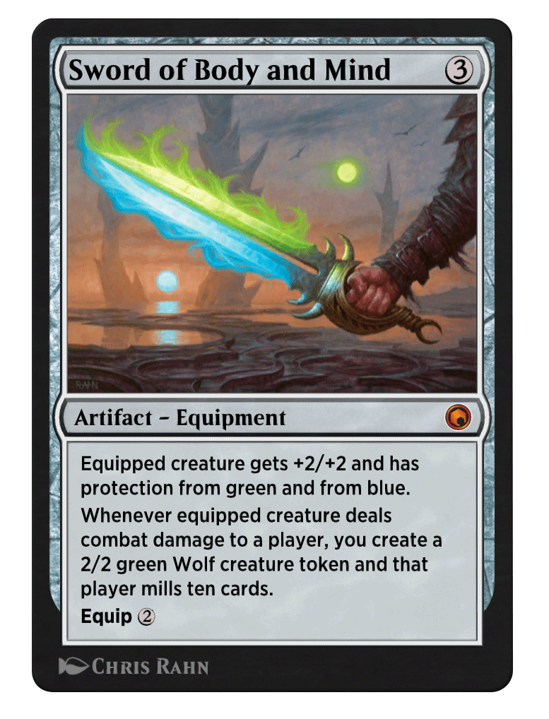 Another Blue-hate sword, Sword of Body and Mind gives the equipped Creature protection from Green and Blue. Ideal in midrange strategies, the triggered ability gives you a 2/2 body. This is an impactful ability because it gives you a blocker to fend off opposing threats. The mill ability on this Equipment won’t win the game often because the incidental mill usually isn’t worth it, especially with the prevalence of graveyard strategies in eternal formats.