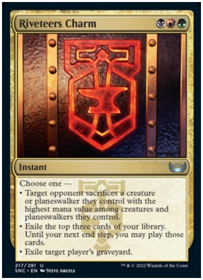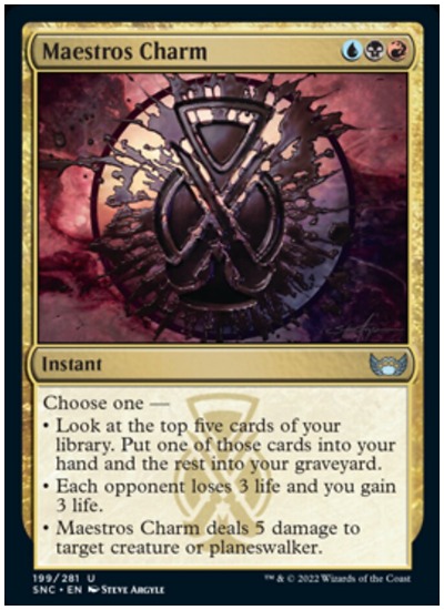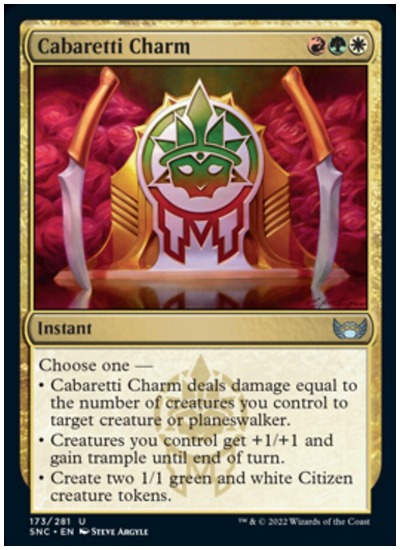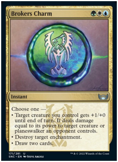 Charms first appeared in MTG in Khans of Tarkir and were given their name via WotC designers who created the Mirage set. A Charm provides an effect or ability that is magical in nature. Within the Streets of New Capenna (SNC) set, the cycle of five Charms is modal (offering a total of three options), and three-colored to thematically tie into each of the five demon crime families that are the main focus of the Standard-legal set.