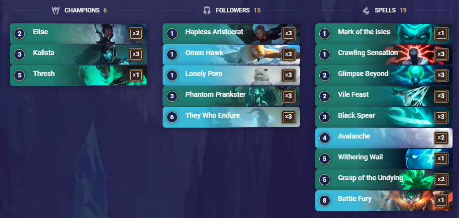 Much like other aggressive decks in LoR, your main priority during the mulligan phase is to find an aggressive curve to play out during the first three turns. Elise alongside one drop units are your best keeps that you should always be aiming for. If you have a solid turn one and turn two play, then you can consider keeping Kalista depending on the match up.