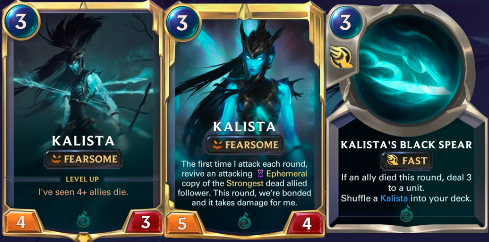 One last deck to consider with Kalista is an Ionian shell which uses Death Mark and Zed to dish out the downside of Ephemeral to your opponent while reviving powerful units that your opponent needs to deal with once Death Mark gives them permanence.