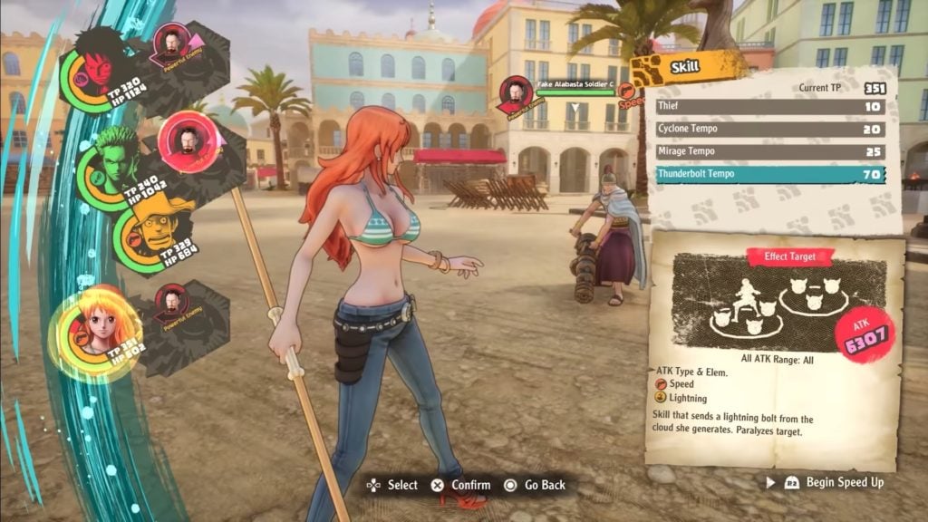 About half—if not more—of the 30-plus hours of Odyssey’s story is spent in Memoria, a dream world that one of the game’s original characters Lim sends the Straw Hats to in order to experience past events from the One Piece story. This is all done because she doesn’t like pirates at the start of the story, never talks to Luffy and the crew, and uses her special plot-device powers to remove all of their strength (which you had just gotten used to during the opening hour) resetting your character’s levels from around level 40 to one.