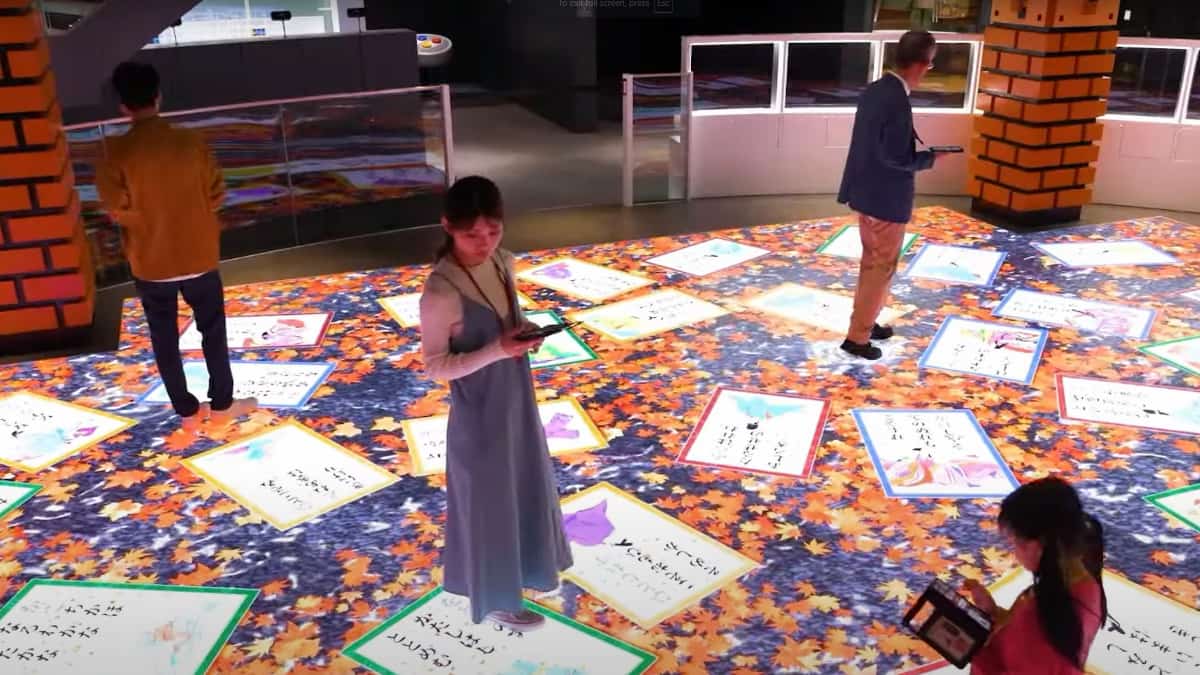 The first floor of the museum is reserved for interactive experiences, such as a massive screen on the lobby floor that projects traditional Japanese card game Hyakunin Isshu. Guests can request an interactive device to play with the cards, creating a life-sized game right on the floor.