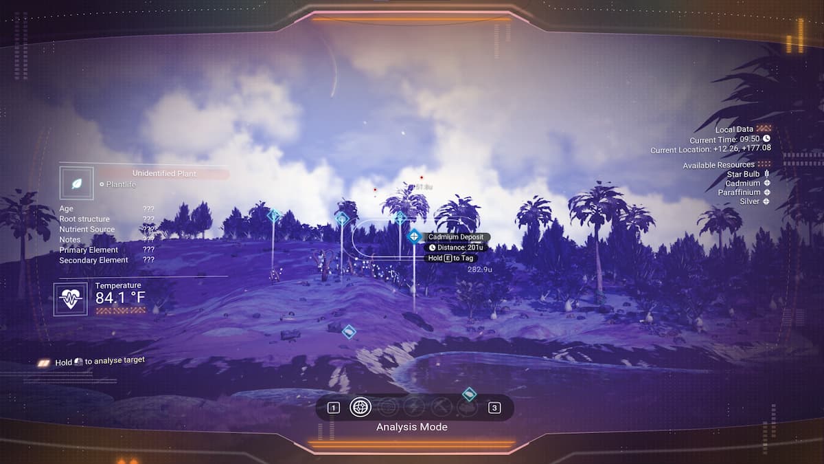 - Open up your analysis visor by holding the F key, or LT on consoles, and look around for Cadmium deposits. Travel to the location of the nearest Cadmium deposit.