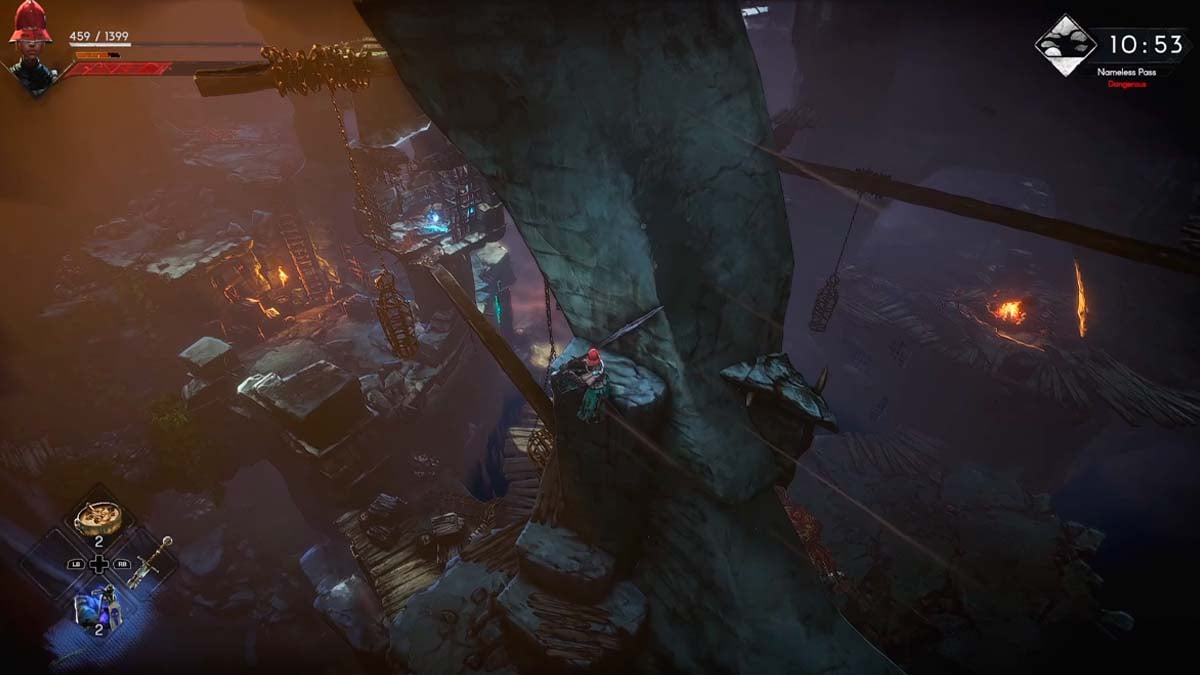 - When you reach a cliff, carefully drop down to land on a ledge. If you hug the pillar for dear life, you can find a long log to get to the opposite side. That’s where you find the Quarry Guard Key to free the prisoner in the Nameless Pass in No Rest for the Wicked.