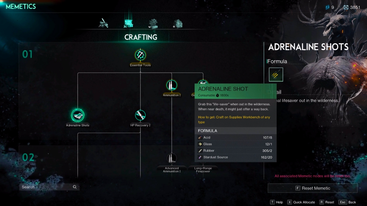 To craft Adrenaline Shots, you need eight Acid, one Glass, two Rubber, and 20 Stardust Sources. You can’t just instantly make Adrenaline Shots though; you must have a Supplies Workbench (which you unlock from the Essential Tools node in the Crafting Tree in Memetics) and unlock the Adrenaline Shot formula in the Crafting section in Memetics. You can unlock these using Memetics Points.