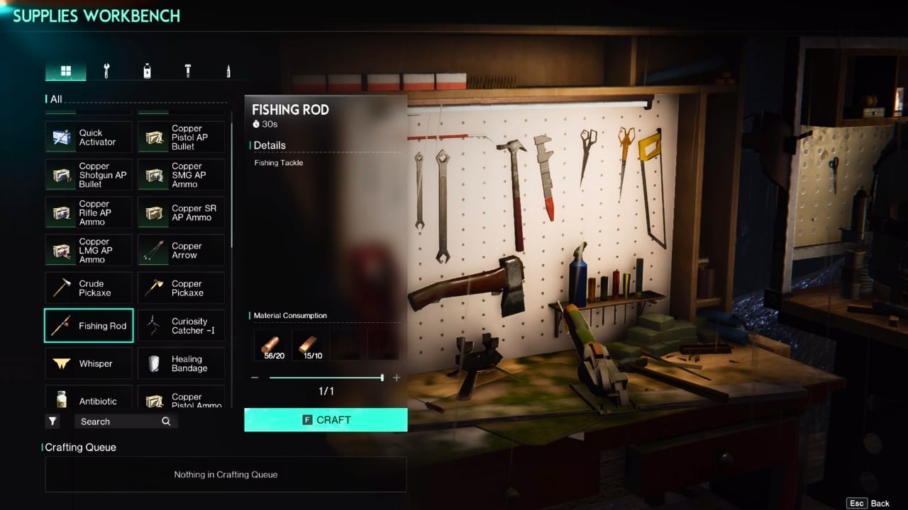 If you’ve never fished, first craft a fishing rod at your Supplies Workbench using logs and copper ingots. Then you can buy bait from Margerie at the docks.