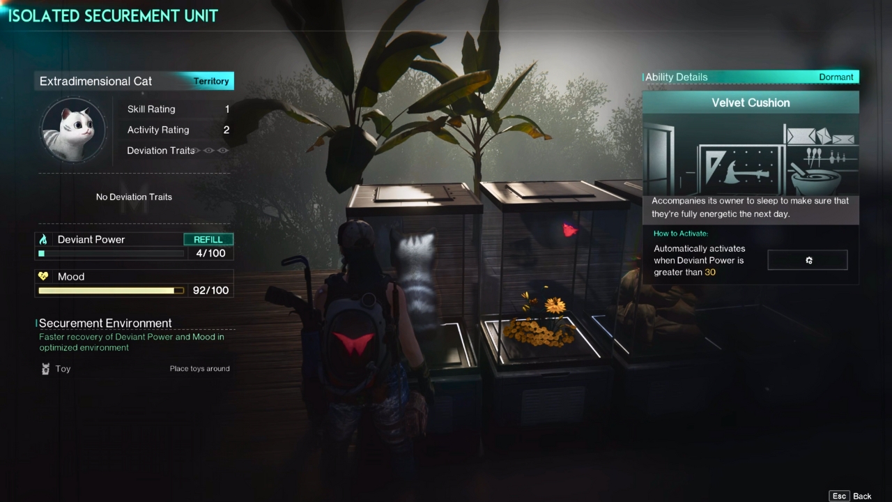 You can increase its Deviant Power Regeneration and Mood by placing the Isolated Containment Unit near toys; this increases its regeneration rate by 20 percent while dormant. You could refill its Deviant Power using its Mood, though this completely depletes its Mood. While Mood is essential for most Deviants, as it determines combat performance and crafting and gathering speed, it doesn’t affect the Cat Snooze buff too much. So, it can be helpful.