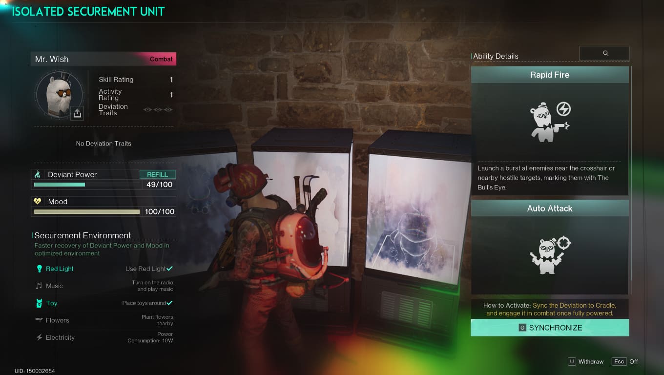 Mr. Wish is an excellent Deviant to store in your Cradle and go out on an adventure to kill enemies farming acid or hunt animals. The elegant Deviant has five requirements to keep his energy high, which is higher than usual Deviants—but that’s a good thing. You can charge its Deviant power quickly and have it ready for most of your travels.