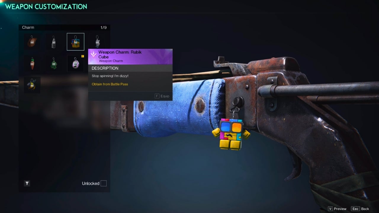 You can also get a weapon charm from the current Twitch drops, and according to the charms list, you can also get a Rubiks Cube charm from the Battle Pass. I haven’t spotted this Rubiks Cube charm in the battle pass I’m working through yet though, so it may come in a later pass rather than the release track.