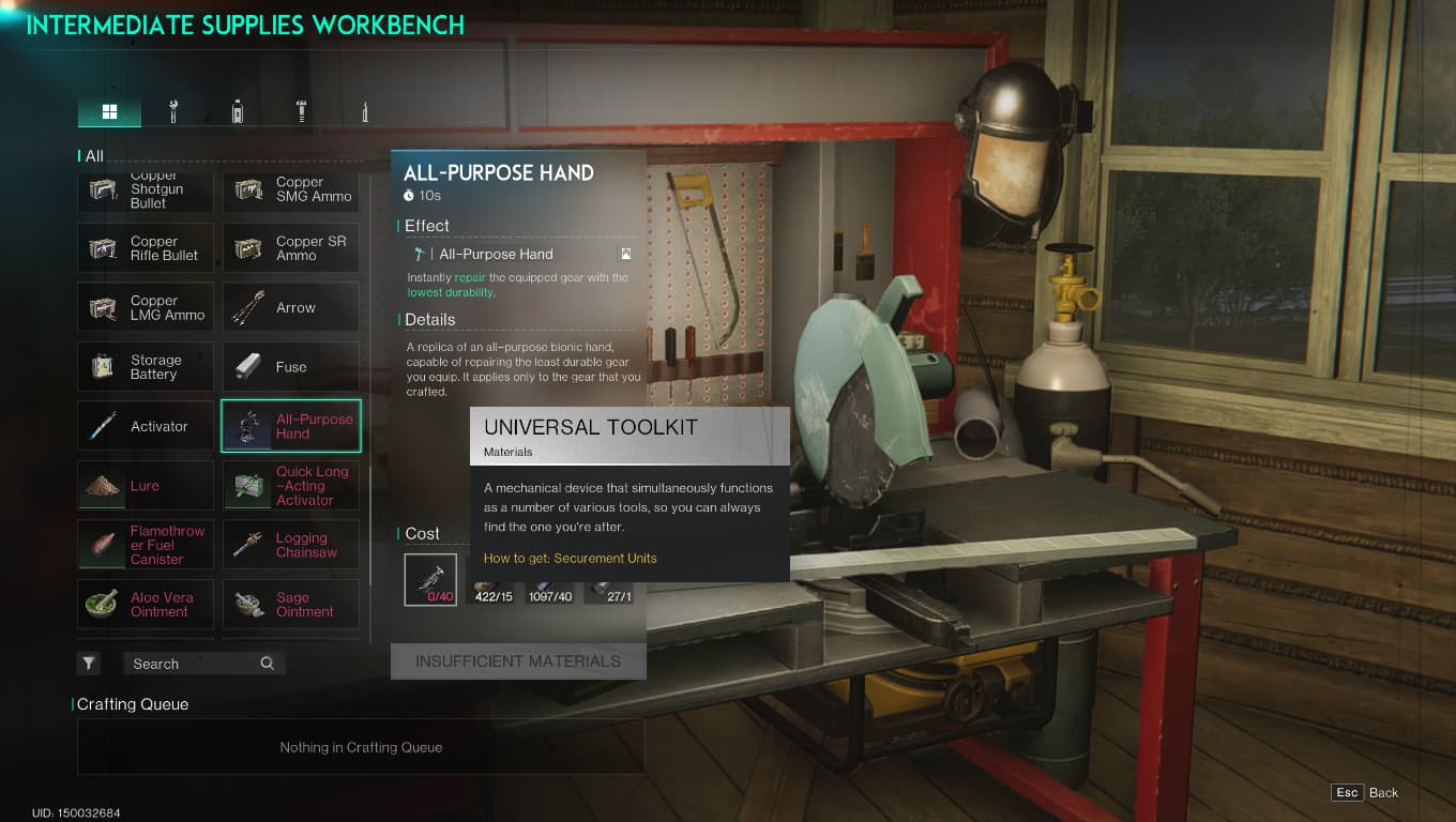 You can use any of the Supply Workbenches to use these Universal toolkits along with Acid, Stardust Source, and any crystal to craft an All-Purpose Hand that instantly repairs your lowest durable gear, saving you plenty of resources. Based on the quality of the crystal you use to make the All-Purpose Hand, you can repair that tier of gear instantly, so keep that in mind while crafting the item and using it. The higher the quality of crystals, the better quality of armor it repairs. The lower-quality crystals cannot repair your legendary gear.