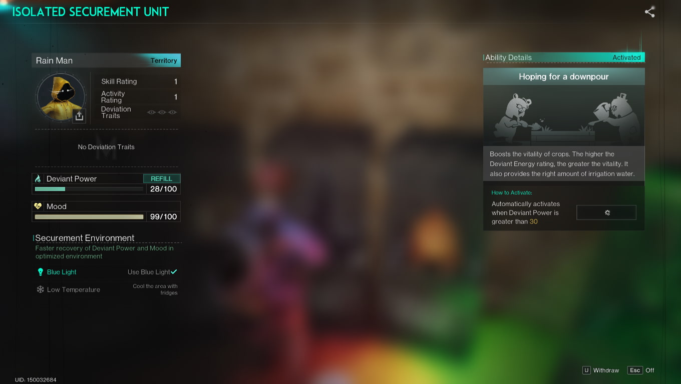 If you have your hands on the Rain Man Deviant, it’s time to store it in the Isolated Securement Unit and plant some crops on loamy soil or planter boxes. Once the deviant power of the Rain Man is above 30, it should directly go to your crops and rain over them to maintain the perfect amount of irrigation to give you a good yield. As the Deviant takes care of watering, you can focus on more important tasks at hand rather than checking your crops manually.