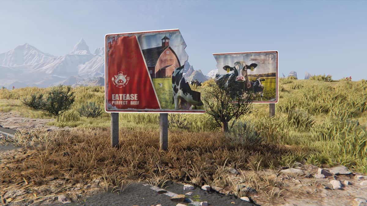 After reaching the spot, you should spot four traffic cones arranged in a square shape. Go near the square and it should tell you to investigate the area by pressing F. After that, you’ll spot the billboards in front of you with cows on them. The two different billboards show the same picture of an advertisement belonging to Eastease Perfect Beef, but they’re broken and placed at a distance. Your goal is to line up these two broken billboards and make them into one billboard from your point of view.